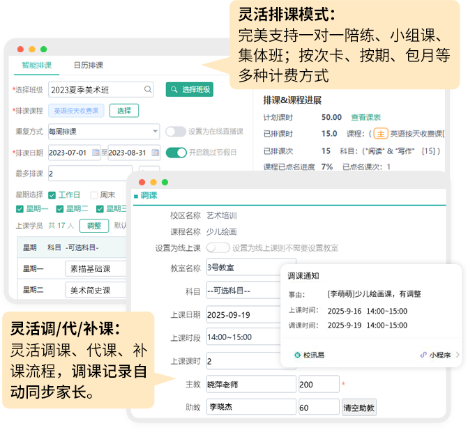 一对一/一对多/集体班排课、规律性/非规律性排课、调课/加课