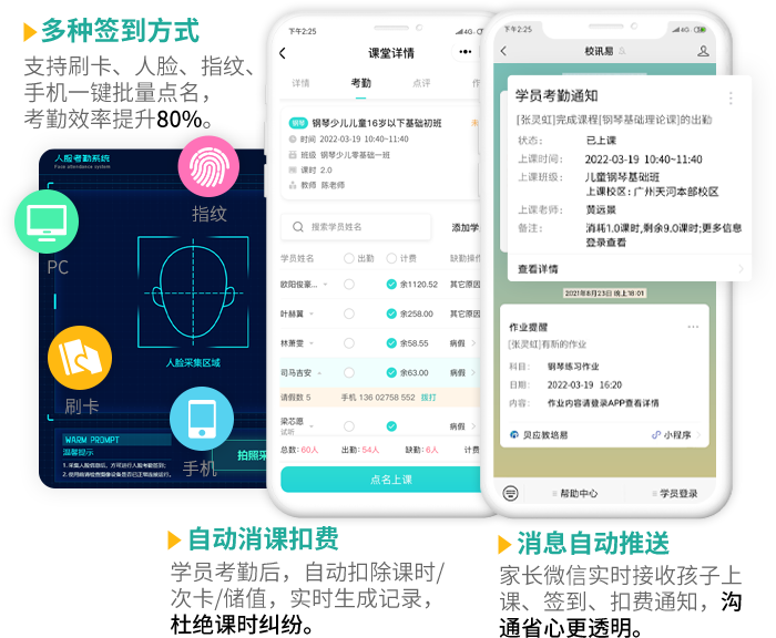 刷卡/指纹/手机点名考勤、考勤消课、签到通知