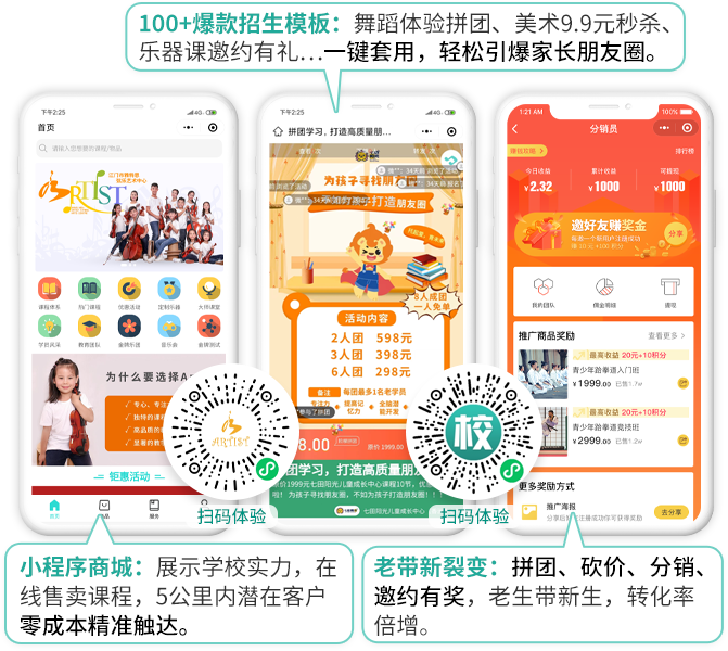 海量招生模板(多场景/玩法:招新、续费、老带新,拼课、优惠券、有奖邀约)