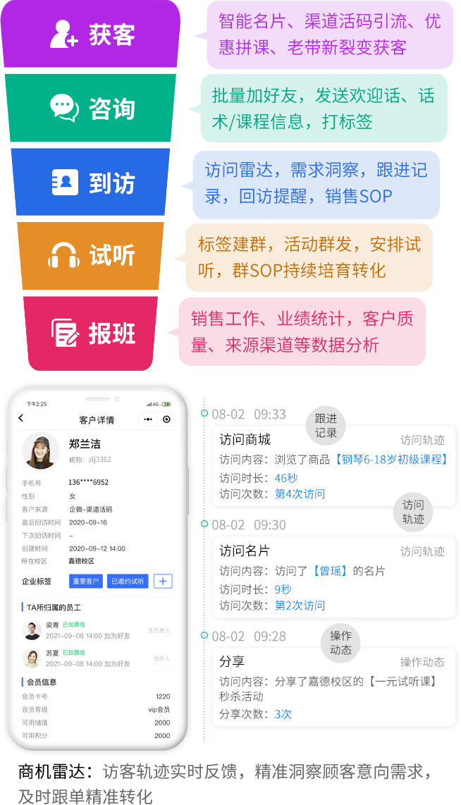 学员档案、教学回访、学员筛选、活动推送、欠费提醒、休学结业