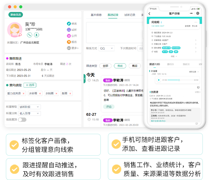 线索分配、销售跟单、跟进提醒、线索公海、外呼系统、业绩统计