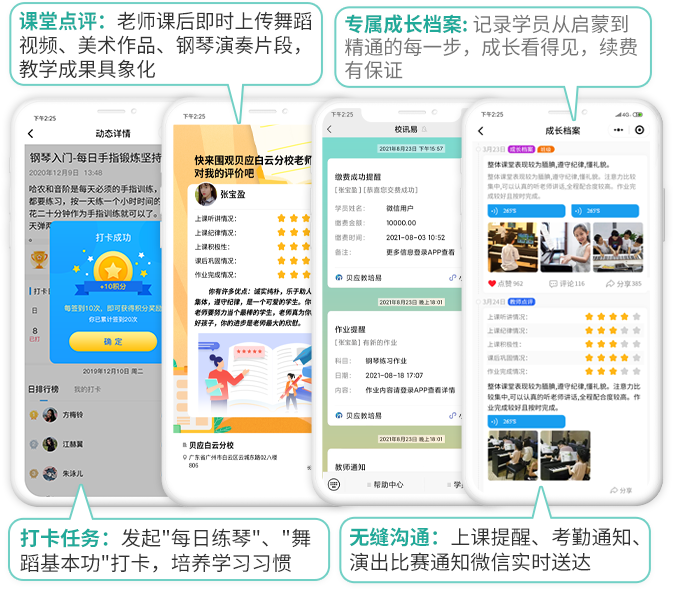 上课/考勤消息推送、打卡作业、师生互评、在线请假/约课、剩余课时查询