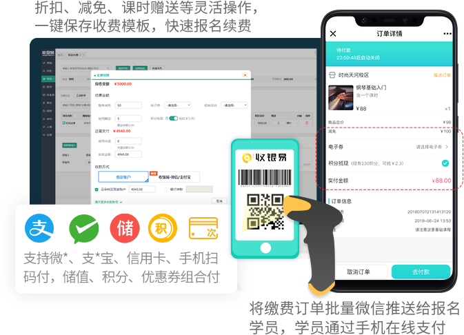 学员登记、报表缴费、学员考勤、购买教财、积分兑换等业务办理