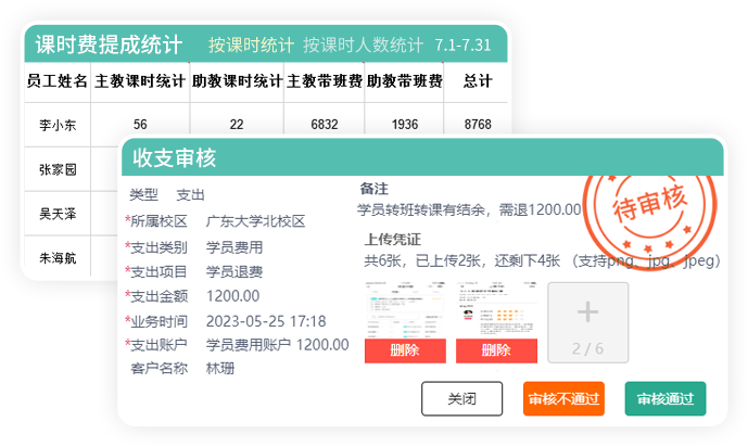培训机构财务管理系统支持严谨的层级审批机制,收费、退费、收支可设置不同角色的审批权限,责任到人,确保每一笔收支均可追溯,可设置微信推送审核提醒,方便手机查看、在线审批快捷高效。