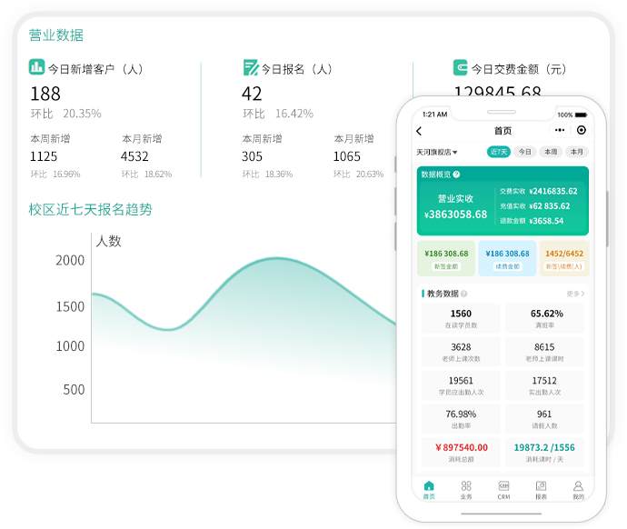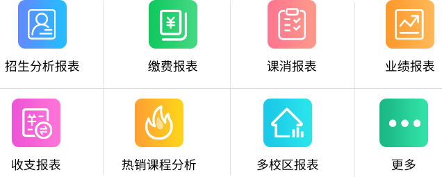 营业汇总、招生报表、课消报表、热销课程分析、多校区报表